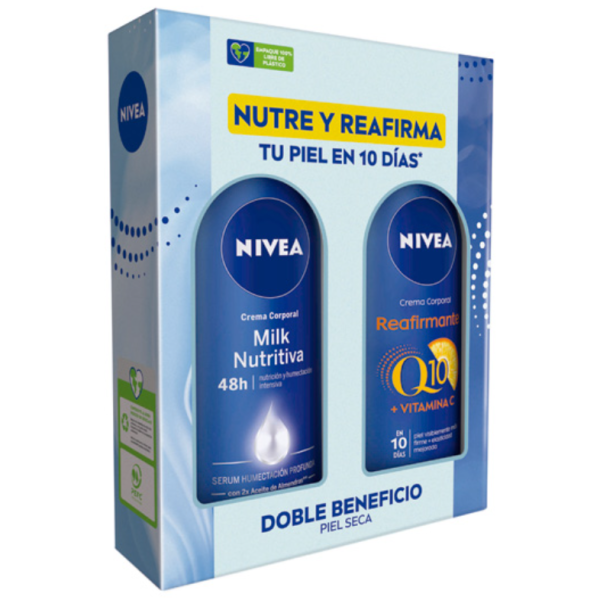 Estuche Nivea Doble Beneficio Piel Seca: Crema Corporal Reafirmante Q10 400ml + Crema Corporal Milk Nutritiva 400ml